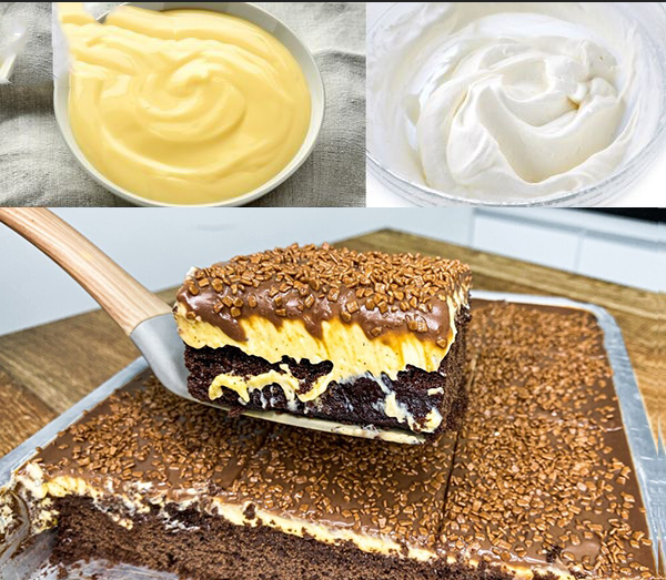1. Zuerst den Teig : Aus Mehl, Butter, Zucker,Backpulver,Salz und Kakaopulver einen Rührteig herstellen. Dann den Teig in eine mit Backpapier ausgelegte Fettpfanne oder große Auflaufform geben und bei 18o °C Umluft ca. 25 Min. goldgelb backen.